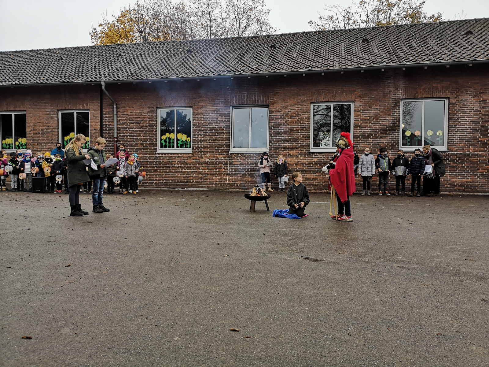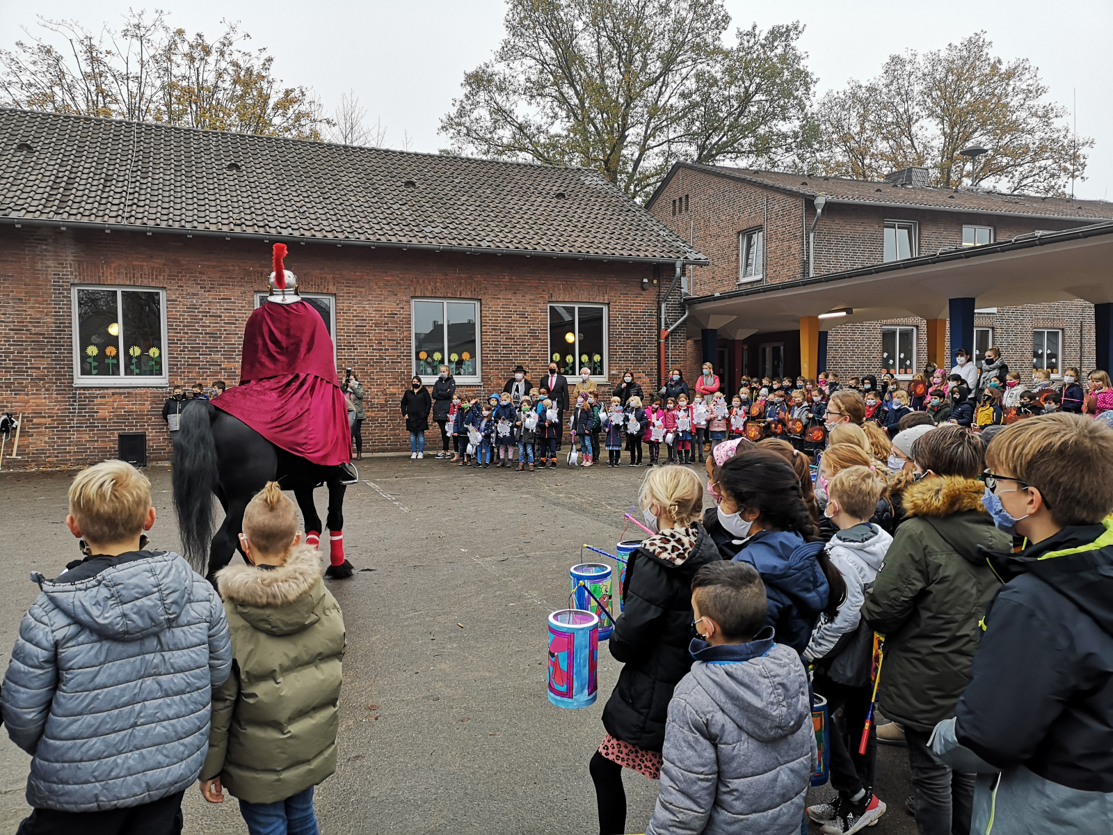 Anschließend begaben sich alle Kinder mit Sicherheitsabstand und Mund-Nasenschutz auf den Schulhof. Die Kinder der Klasse 4a und 4b führten das Martinsstück auf und selbst Sankt Martin mit seinem Pferd stattete der St. Peter Schule einen Besuch ab.