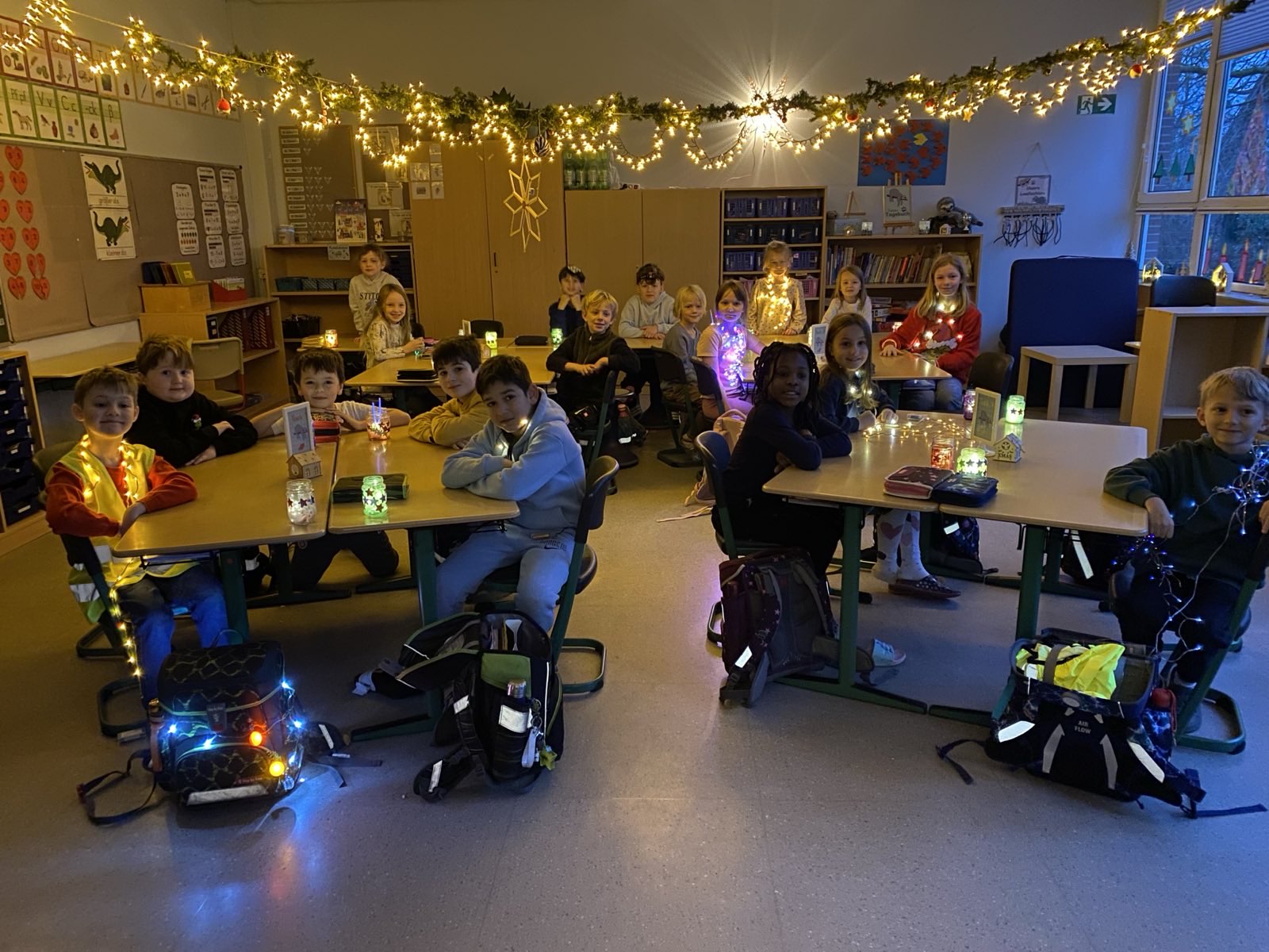 Am Freitag war der Schulweg und der Schulhof morgens in der Dunkelheit hell erleuchtet. Die meisten Kinder der Schule kamen mit Lichterketten, Lampen oder reflektierenden Kleidungsstücken in die Schule. Grund dafür war die „Glühwürmchen Aktion“ der Verkehrswacht, an der auch unsere Schule teilnnahm. Ziel der Aktion ist es, die Autofahrer darauf aufmerksam zu machen, immer, aber besonders in der Dämmerung, auf kleine Verkehrsteilnehmer zu achten und das Fahrverhalten anzupassen. Auch die Klassenräume leuchteten anschließend besonders hell. Vielen Dank an alle, die mitgemacht haben!